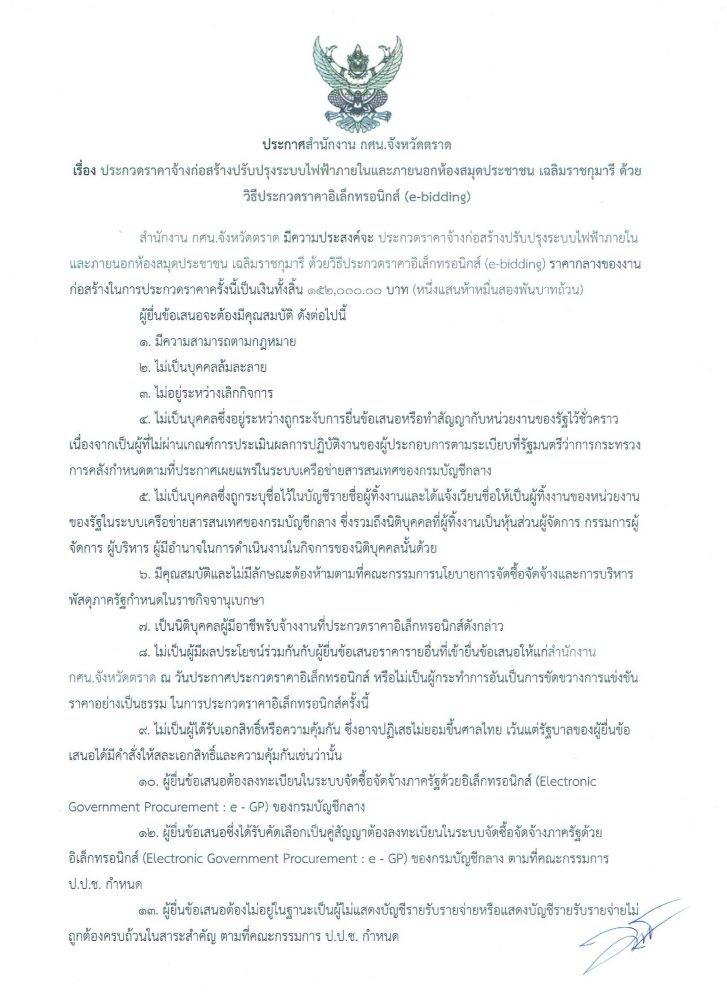 ประกวดราคาจ้างก่อสร้างปรับปรุงระบบไฟฟ้าภายในและภายนอกห้องสมุดประชาชน เฉลิมราชกุมารี ด้วยวิธีประกวดราคาอิเล็กทรอนิกส์(e-bidding)