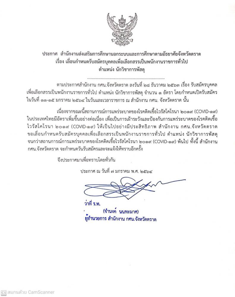เลื่อนกำหนดรับสมัครบุคคลเพื่อเลือกสรรเป็นพนักงานงานราชการทั่วไป