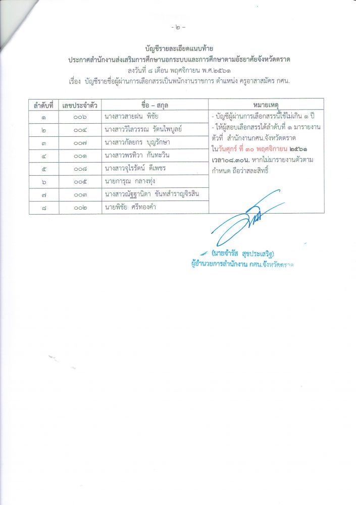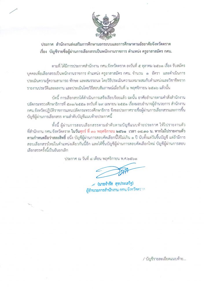 ประกาศ สำนักงาน กศน.จังหวัดตราด เรื่อง รายชื่อผู้ผ่านการเลือกสรรเป็นพนักงานราชการ ตำแหน่งครูอาสาสมัคร กศน.