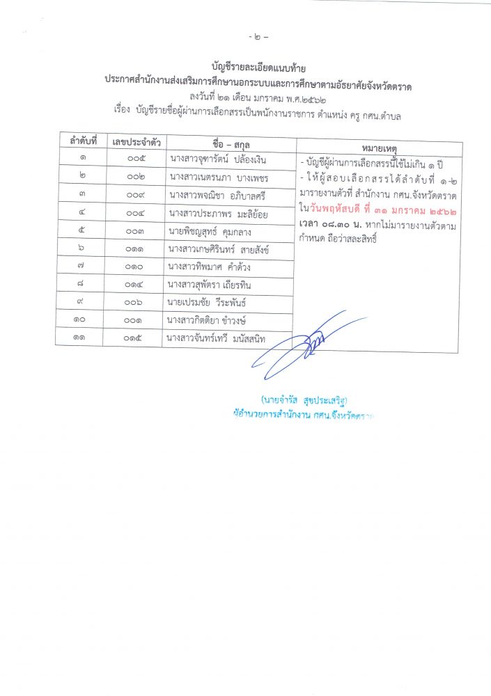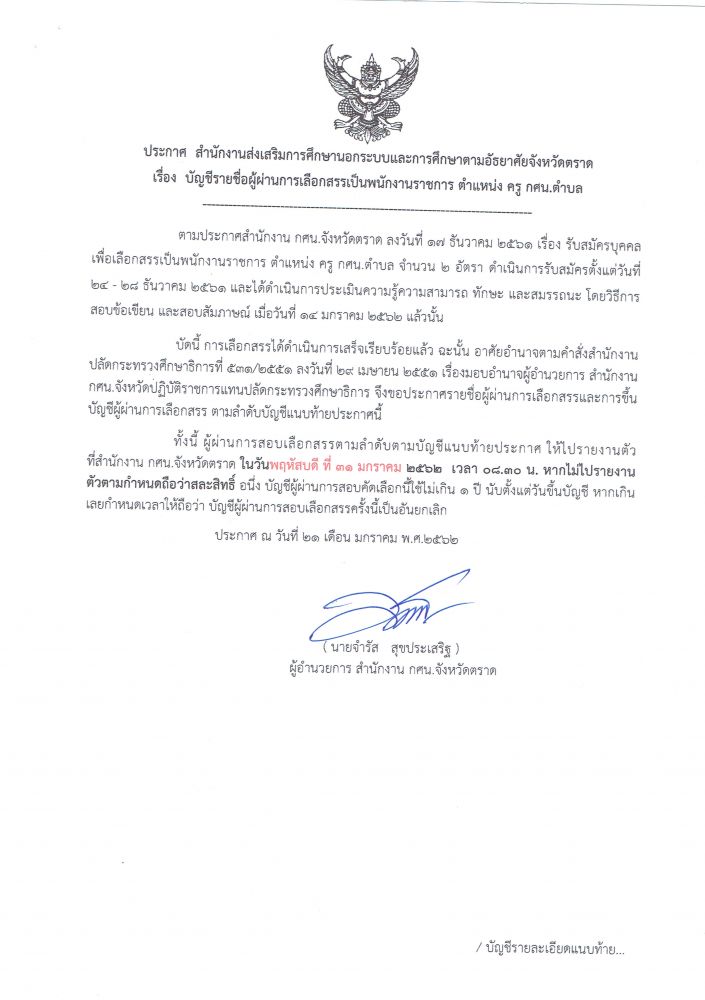 ประกาศ รายชื่อผู้ผ่านการเลือกสรรเป็นพนักงานราชการ ตำแหน่ง ครู กศน.ตำบล