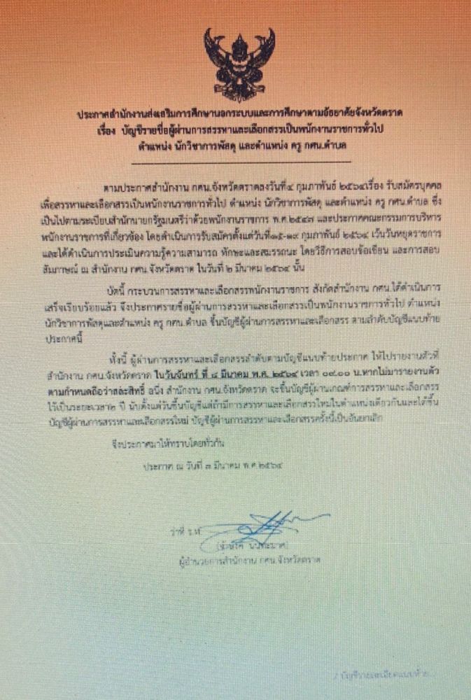 ประกาศสำนักงานส่งเสริมการศึกษานอกระบบและการศึกษาตามอัธยาศัยจังหวัดตราด