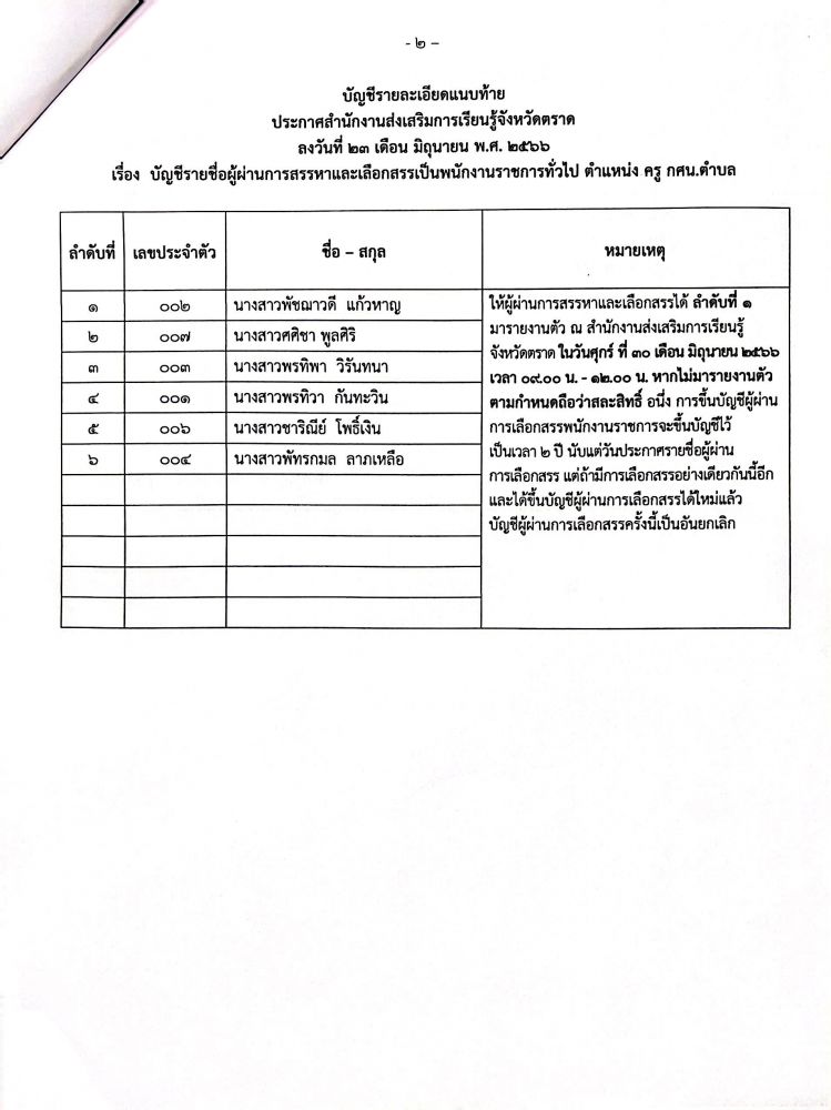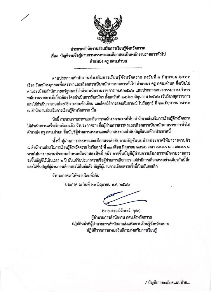 ประกาศ บัญชีรายชื่อผู้ผ่านการสรรหาและเลือกสรรเป็นพนักงานราชการทั่วไป ตำแหน่ง ครู กศน.ตำบล