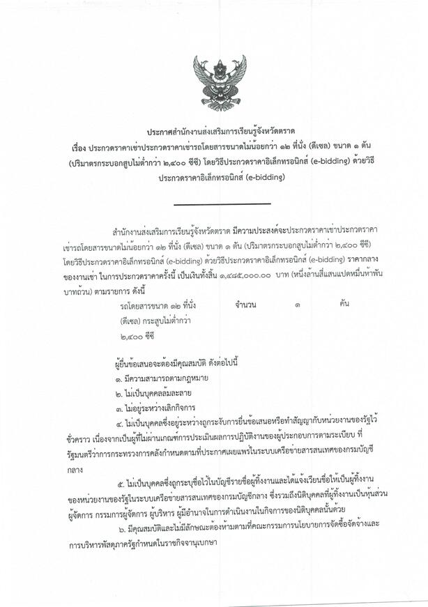 หมวดหมู่ : ข่าวประชาสัมพันธ์ หัวข้อเรื่อง : เรื่อง ประกวดราคาเช่ารถโดยสารขนาดไม่น้อยกว่า 12 ที่นั่ง (ดีเซล) ขนาด 1 คัน (ปริมาตรกระบอกสูบไม่ต่ำกว่า 2400 ซีซี) โดยวิธีประกวดราคาอิเล็กทรอนิกส์ (e-bidding) ด้วยวิธีประกวดราคาอิเล็กทรอนิกส์ (e-bidding)