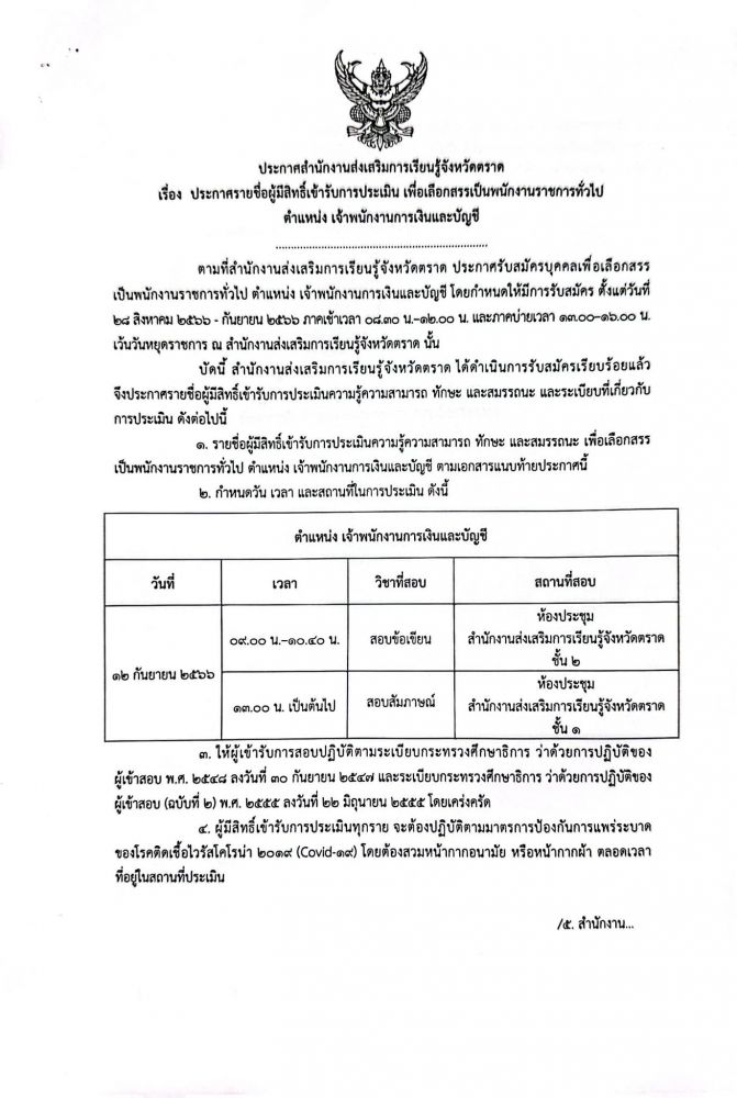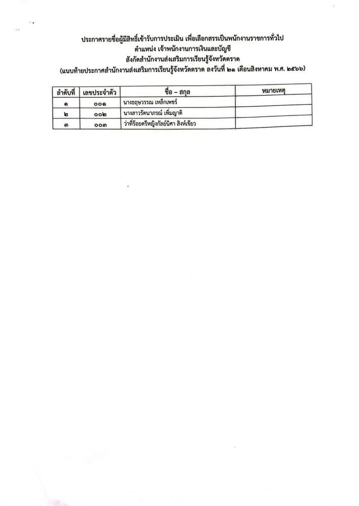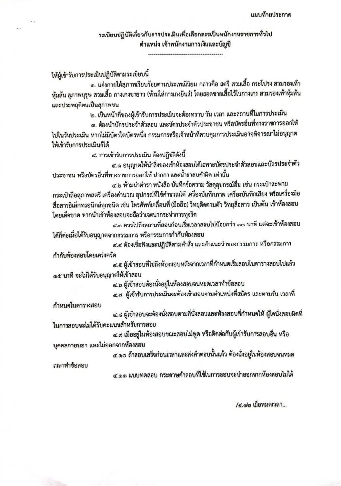 เรื่อง ประกาศรายชื่อผู้มีสิทธิ์เข้ารับ การประเมิน เพื่อเลือกสรรเป็นพนักงานราชการทั่วไป ตำแหน่งเจ้าพนักงานการเงินและบัญชี