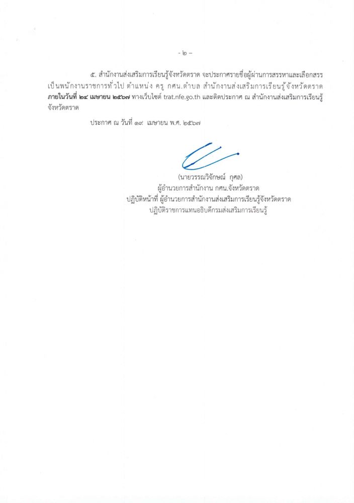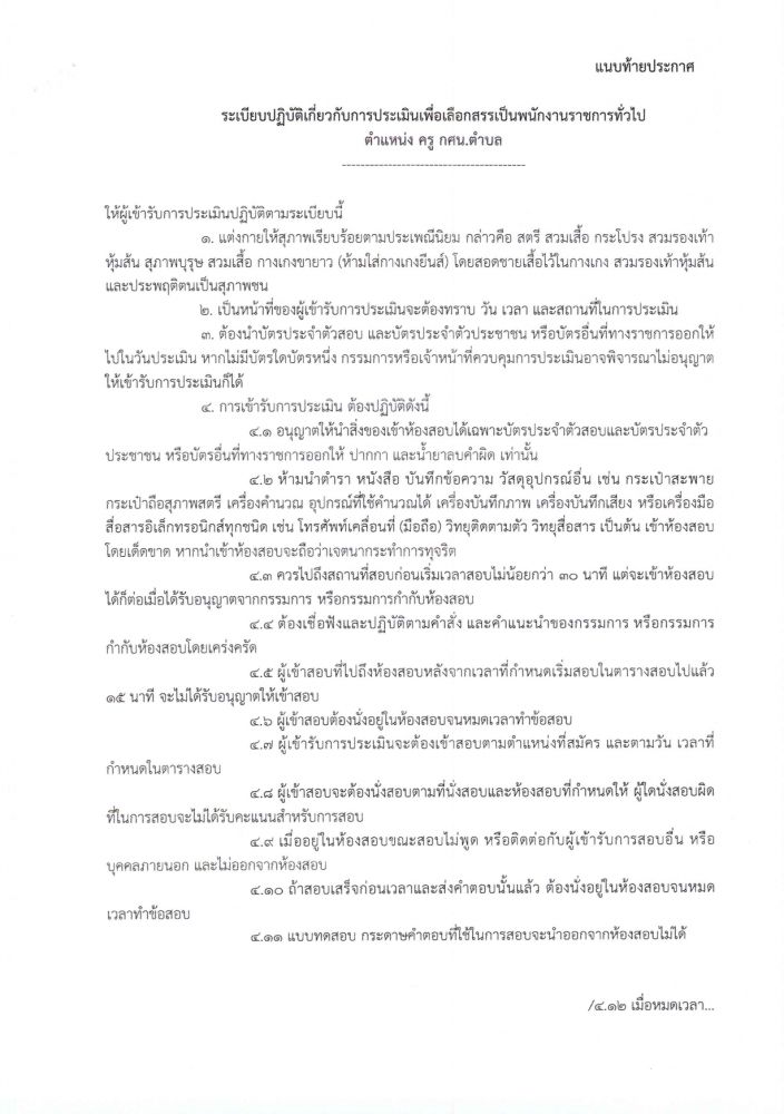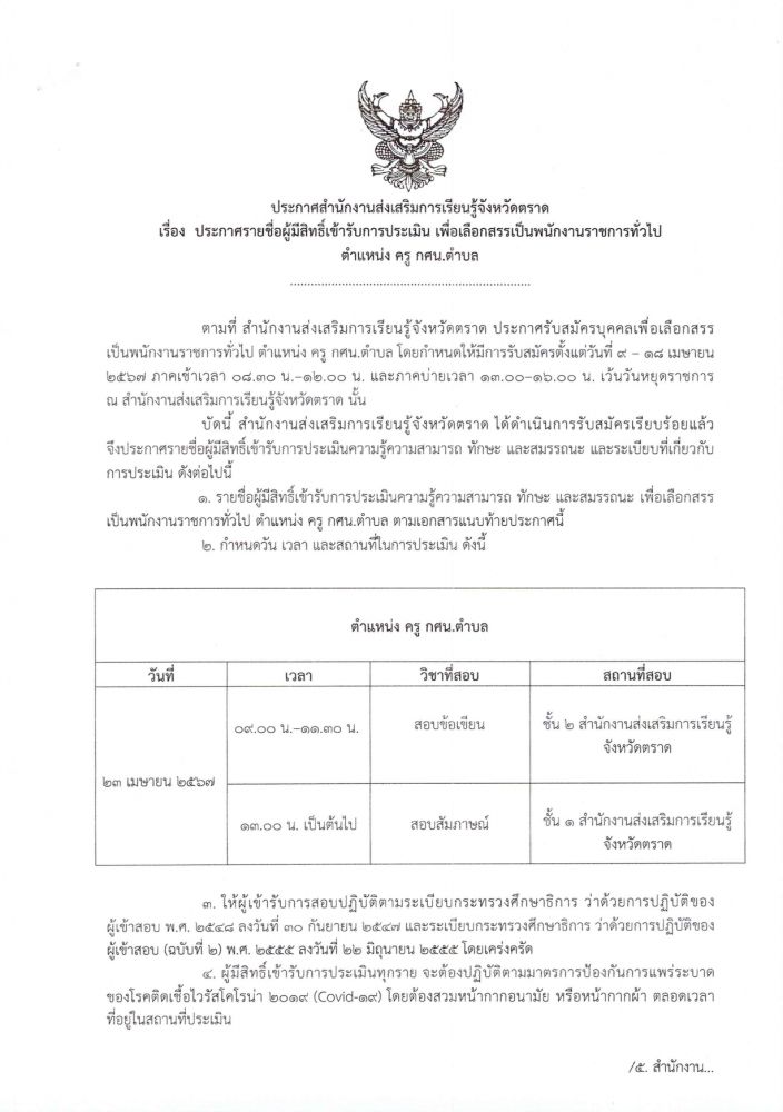 ประกาศรายชื่อผู้มีสิทธิ์เข้ารับการประเมิน เพื่อเลือกสรรเป็นพนักงานราชการทั่วไป ตำแหน่ง ครู กศน.ตำบล