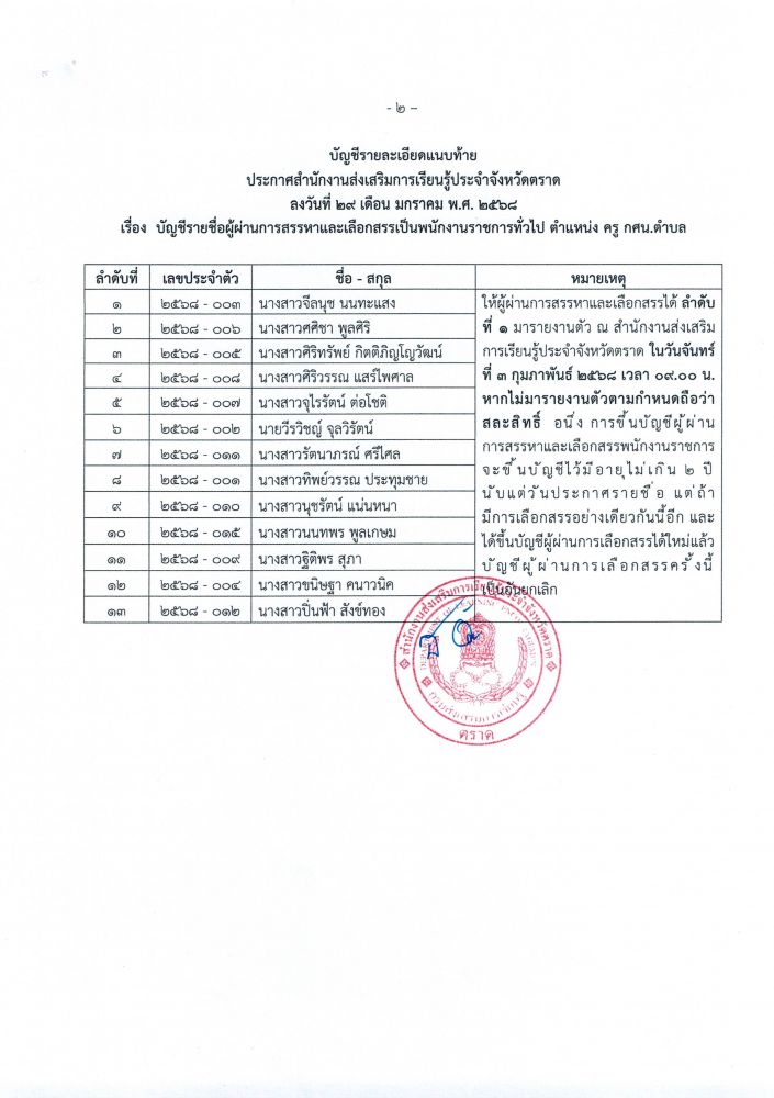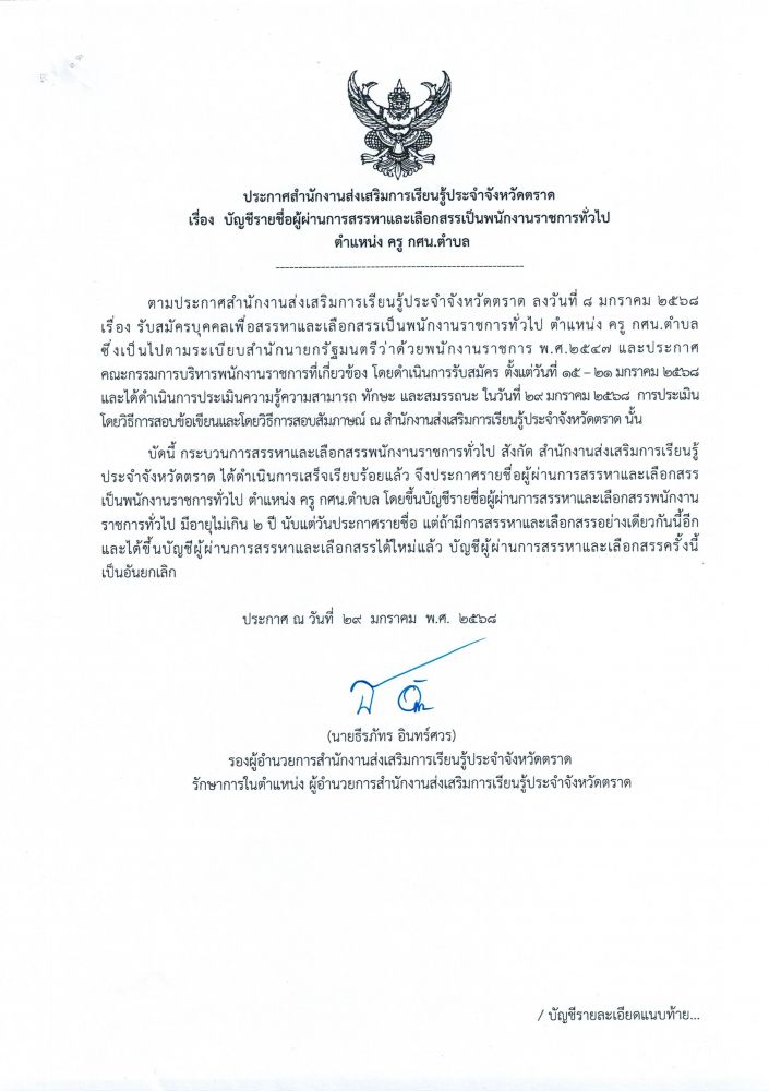 ประกาศสำนักงานส่งเสริมการเรียนรู้ประจำจังหวัดตราด เรื่องบัญชีรายชื่อผู้ผ่านการสรรหาและเลือกสรรเป็นพนักงานราชการทั่วไป ตำแหน่ง ครู กศน.ตำบล