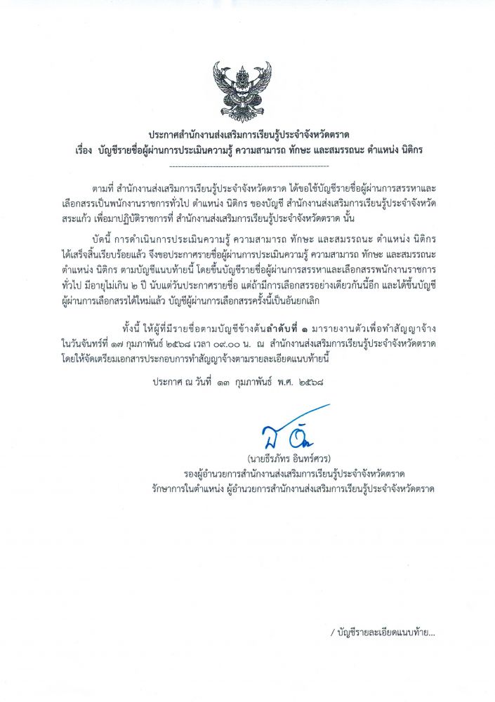 ประกาศสำนักงานส่งเสริมการเรียนรู้ประจำจังหวัดตราด เรื่อง แผนการส่งเสริมการเรียนรู้ของจังหวัดตราด (พ.ศ. ๒๕๖๘ - ๒๕๗๐)