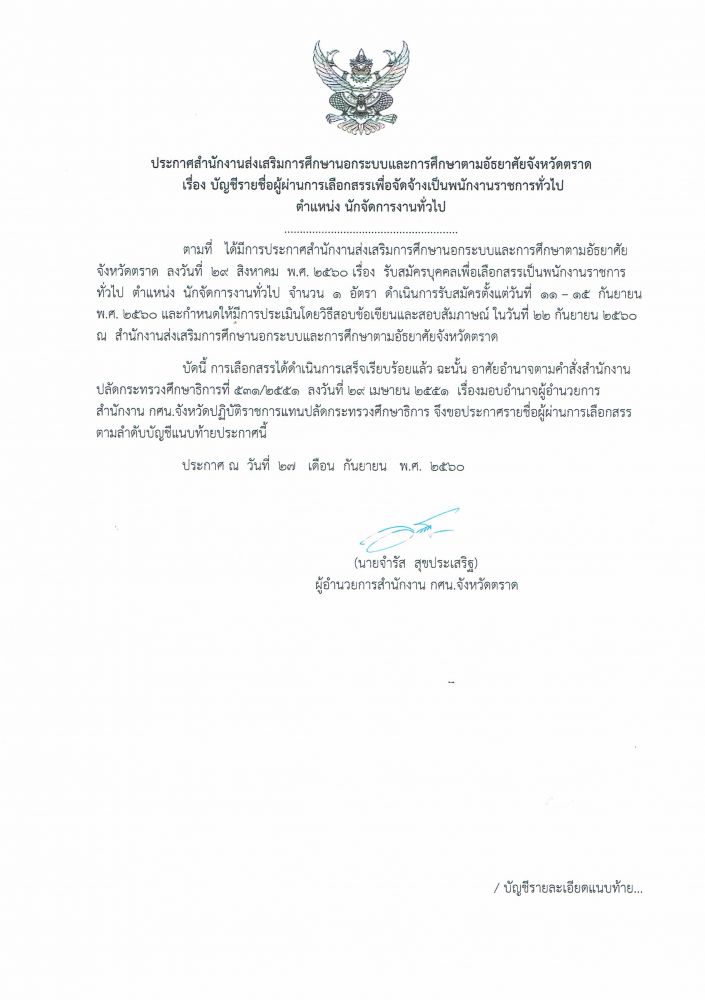 ประกาศ บัญชีรายชื่อผู้ผ่านการเลือกสรรเพื่อจัดจ้างเป็นพนักงานราชการทั่วไป