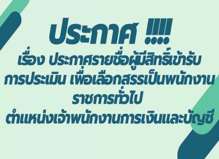 เรื่อง ประกาศรายชื่อผู้มีสิทธิ์เข้ารับการประเมิน เพื่อเลือกสรรเป็นพนักงานราชการทั่วไป ตำแหน่งเจ้าพนักงานการเงินและบัญชี