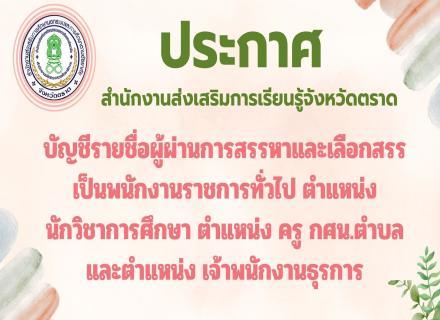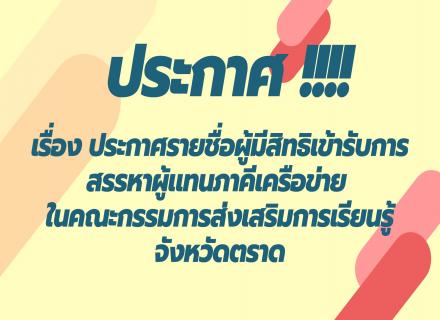 ประกาศสำนักงานส่งเสริมการเรียนรู้จังหวัดตราด เรื่อง ประกาศรายชื่อผู้มีสิทธิเข้ารับการสรรหาผู้แทนภาคีเครือข่าย ในคณะกรรมการส่งเสริมการเรียนรู้จังหวัดตราด