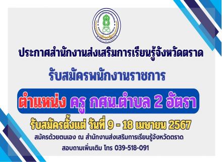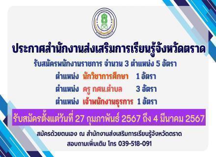 ประกาศสำนักงานส่งเสริมการเรียนรู้จังหวัดตราดรับสมัครพนักงานราชการ จำนวน 3 ตำแหน่ง5 อัตรา 1. ตำแหน่ง นักวิชาการศึกษา 1 อัตรา2. ตำแหน่ง ครูกศน. ตำบล 3 อัตรา ตำแหน่ง เจ้าพนักงานธุรการ 1 อัตรา รับสมัครตั้งแต่วันที่ 27 กุมภาพันธ์ 2567 ถึง 4 มีนาคม 25