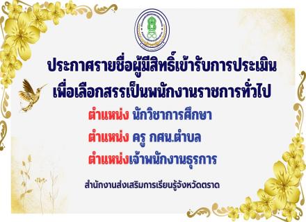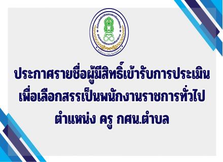 ประกาศรายชื่อผู้มีสิทธิ์เข้ารับการประเมิน เพื่อเลือกสรรเป็นพนักงานราชการทั่วไป ตำแหน่ง ครู กศน.ตำบล