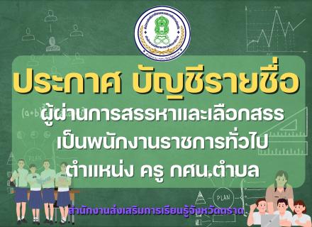 ประกาศ บัญชีรายชื่อผู้ผ่านการสรรหาและเลือกสรรเป็นพนักงานราชการทั่วไป ตำแหน่ง ครู กศน.ตำบล